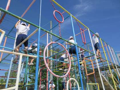 2年生はじめての体育の学習では,総合遊具の使い方を学びました。両手両足のうち,3点を必ず遊具につけることを約束として,焦ることなくゆっくり登るように取り組んでいます。早速,休み時間にチャレンジする子たちでした。安全にはくれぐれも気をつけて,楽しくあそんでほしいと思います。