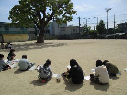 木曜日の図工の学習では,校内のお気に入りの風景を絵の具でスケッチしました。グループごとに校庭や体育館,プールなど,思い思いの場所を回ってスケッチしました。中でも校庭の樟の木が大人気で,気持ちのよい太陽を浴びながら,真剣な表情でスケッチをしていました。