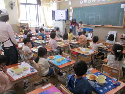 食べる前に食器の中に入っているハッピーキャロットを見つけた子は嬉しそうにしていました。1年生の中には,2つも入っていたラッキーボーイがいました。