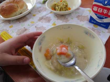 バターうずまきパン・キャベツのクリーム煮・ツナともやしのカレーソテー・牛乳