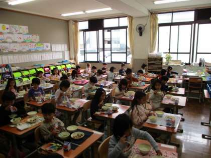 今日の給食の献立は,ごはん,牛乳,なま節と厚あげの煮つけ,かきたま汁でした。栄養教諭の早田江美先生が1年生の給食指導にはいりました。今日は,「なま節」のお話でした。なま節は何の魚で,どんな栄養があるのかなどをクイズ形式で教えてもらいました。初めて食べる子が多かったのですが,おいしくいただきました。
