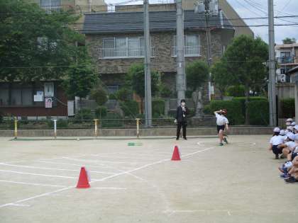 普段からドッジボールなどでボールを投げ慣れている子はきれいなフォームで遠くまで投げることができていました。