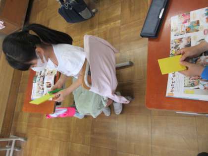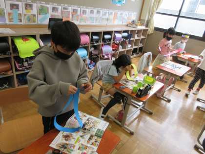 図画工作科ではホチキスの使い方の学習をした後,色画用紙と輪ゴムを使ってわっかをつくりました。想像をふくらませ,うでわ,ベルト,お面など作りたいものを考えて作っていました。次回はつくったわっかに,絵をかいたり,画用紙などで飾りをつけたりしていきます。