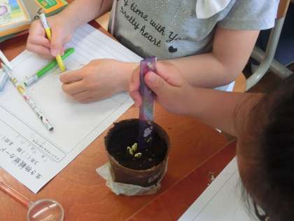 自分の植えた植物の芽が出てきて,子どもたちはとても嬉しそうでした。