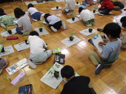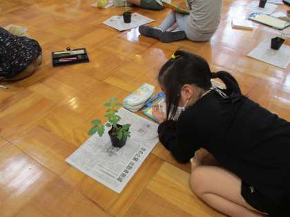 観察のポイントをみんなで確認してから,一人一人がじっくりと観察しました。葉っぱの形や大きさはもちろん,さわってみた手触りやにおいなども確かめて記録していました。