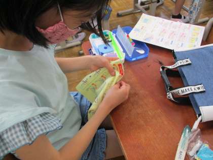 前回までの学習で,わたしたちの身の回りには,手提げかばんや給食袋,衣類やエプロンなど,針と糸があればできるものがたくさんあるということに気が付きました。子どもたちの中には,これまでに針や糸を扱った経験が全くないという人も多く,玉結びや玉どめに悪戦苦闘しながらもがんばって手ぬいにトライしていました。これからしっかり練習をして,針と糸を使って,生活をより豊かに,より楽しくしていきたいですね。
