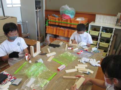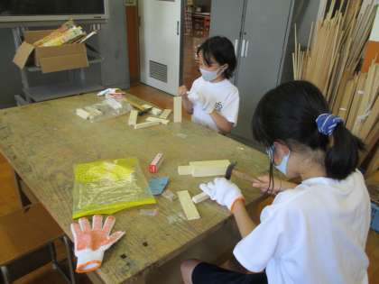 4年生の図工では,「ギコギコトントン」という単元で,木材を使った作品作りに取り組んでいます。木材をのこぎりで切ったり釘打ちをしたりと,初めてのことで苦戦しながらも一生懸命取り組んでいました。どんな作品に仕上がるか楽しみですね。
