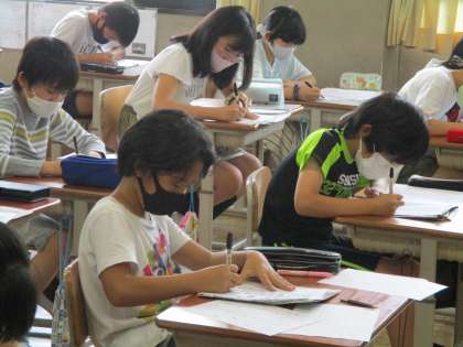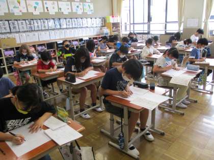 文字の大きさと配列に気をつけて,「竹取物語」の視写に挑戦しました。「竹取物語」は現在,国語科でも学んでいますが,古典特有の格調高い文体に,子どもたちも真剣な表情で視写に取り組んでいました。今日の書写は硬筆でペンを使った学習でしたが,いつもの筆とはまた違った面白さと難しさがあったようです。