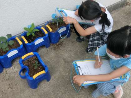 前回と比べてどのように変化しているのかをよく観察すると,葉の数や草たけ,葉の大きさなど,色々な視点から成長していることが分かりました。子どもたちも,細かいところまでしっかり観察して,カードに記録していました。