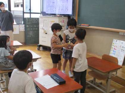 わかば学級でお花をプレゼントする計画をしています。今日は、2年にプレゼントをしました。1年生が代表でもっていきました。これから,学校中を花いっぱいにしていきたいです。