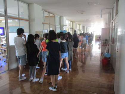 訓練開始の放送が入ると,各教室で担任の先生の指示に従い,静かに廊下に並び,避難する姿が見られました。