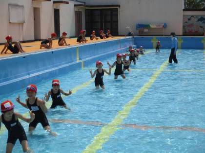 待ちに待ったプール開き!!子ども達はワクワク・ドキドキ。おそるおそるプールに入りました。カニ歩きをしたり,ワニ歩きをしたり・・・。水遊び一日目を楽しみました。