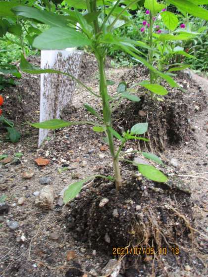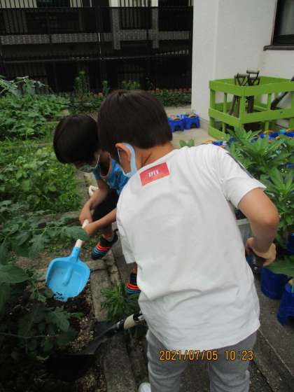 金曜日からの雨で野菜が大変なことになっていました。今日(月曜日)見ると土が流されて根がでていました。そのままにしておくと枯れてしまいます。みんなで、土をもう一度盛り直しました。みんなスコップを上手に使って土を元通りにしてくれました。よかったね。