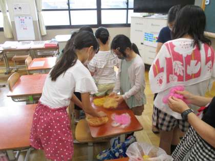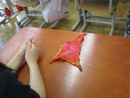 今日は毛糸を自分で重ねて,オリジナルのフェルトをつくりました。色の組み合わせや重ね方,形などを工夫しながら,作っていました。