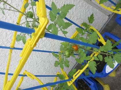 生活科で育てているトマトの実が少しずつ赤くなってきました。観察すると,「わたしのはもうすこしで赤くなるね。」「前と比べてどれくらいのびたかな。」と待ち遠しい様子でした。実ができたら,持ち帰りますので,お家で味わって食べてくださいね。