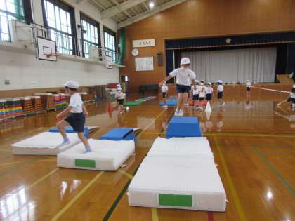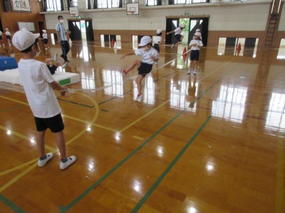 跳びあそびでたくさん跳んでいます。はじめの時と比べて,最後の1歩を大きく跳ぶことができるようになってきました。運動会でも,アイデア走で跳ぶコースがありますので,頑張ってほしいです。1時間の学習が終わると,やりきったという充実感がみなぎっている様子が伝わってきました。
