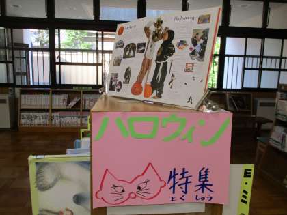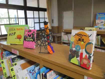 今月はハロウィンということで,絵本コーナーにハロウィンにちなんだ魔女やカボチャなどの本を並べたり,折り紙や画用紙などで飾り付けをしてくれて,楽しい雰囲気づくりをしてくれています。