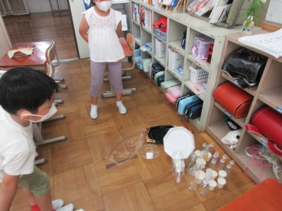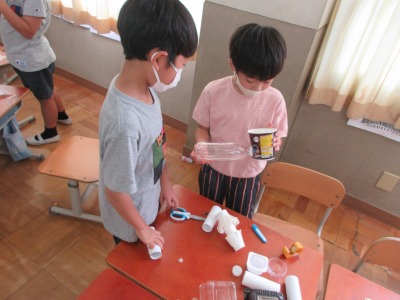 生活科で廃材を利用しておもちゃ作りに取り組んでいます。牛乳パックで迷路を作ったり,ペットボトルでボウリングを作ったり,それぞれが工夫して活動していました。空き箱や空き容器などたくさんご協力していただき,ありがとうございます。