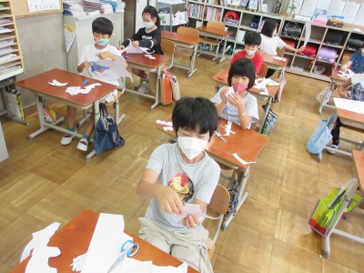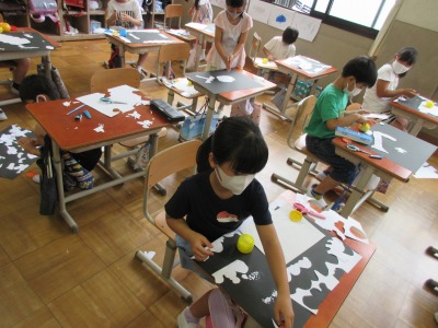 図画工作では,はさみで画用紙を自由に切り,いろいろな形に見立てて,黒の画用紙に貼って表しました。夜の屋台を表現したり,深海の世界を表したり,いろいろな見方があってとても興味深かったです。