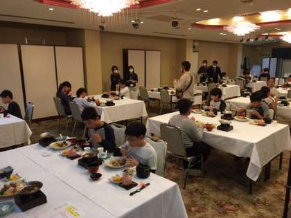 夕食の時間です。豪華なお料理が目の前に並び、子どもたちは嬉しそうでした。黙食になりますが、みんなもりもりと食べています。
