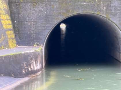 少し歩くと四宮船溜まりに到着しました。四宮船溜まりにあるトンネルの入り口から,出口が見えました。近いように見えたのですが,周りを歩くと10分ほどかかり,トンネルの大切さを感じていました。