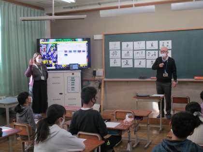 ALTの先生も来られる日だったので,中学校の先生とALTの先生とのやり取りをよく聞きながら,子どもたちは一緒に発音したり,聞かれたことに答えたりしていました。
