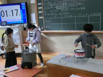 子どもたちは,色々な楽器の音を鳴らし,音が鳴っている時には,ものがふるえているということに気付きました。