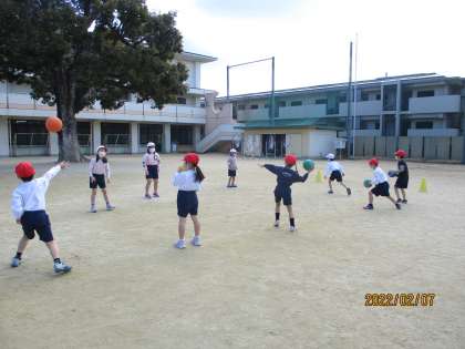 体育で「パスゲーム」の学習をしています。まず,友だちにパスをする練習から始めました。なかなか正確にパスをするのは難しく,相手が受けやすいボールを投げる練習を何度もしました。ゴールに入れる練習もしました。山ボールを投げるのも初めてで,一生懸命練習をしました。