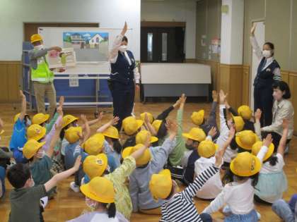 最初に,道路を歩く時の約束や道路を渡るときの5つの約束「おうだんほどう」「とまる」「みる」「あいず」「まつ」についてお話していただきました。