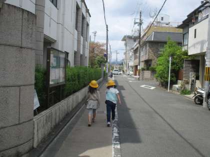 その後,実際に西大路通りまで自分たちで歩いて,信号を渡る練習をしました。交差点の手前で止まり,信号を確かめ,青になっても車が来ていないかをよく見て,手を挙げながら横断歩道をわたりました。