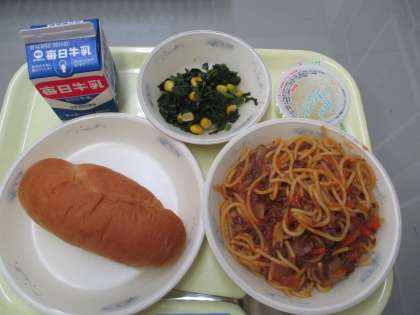 こがたコッペパン・スパゲッティのミートソースに・ほうれんそうのソテー・ぎゅうにゅう・りんごゼリー