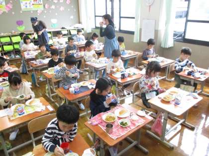 準備が整い,「いただきます」をしてからは,みんなとってもうれしそうに給食を食べていました。今は感染対策のためマスクを外す給食中は『黙食』ですが,きっと心の中で「おいしいな」と思ってくれていたと思います。