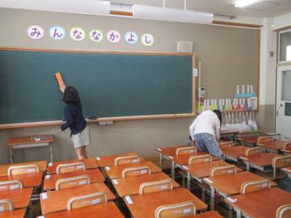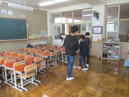まだ掃除の仕方を教えてもらっていない1年生の教室には6年生が掃除に来てくれます。少ない人数ですが,役割分担をしながら,どんどん進めて,あっという間に掃除を終わらせてくれています。6年生ありがとう。