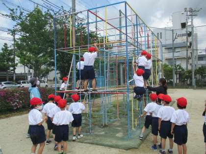 手足のどこか3か所がつねに遊具に接している三点支持の仕方や親指を使ってしっかりと握る握り方などをみんなで確かめました。