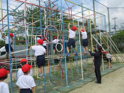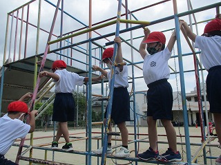 その後,実際に遊具を使って一人一人練習をしました。慣れるまでは授業中や教職員のいる時に一緒に使っていきますが,安全に気をつけて遊べるようになってほしいと思います。