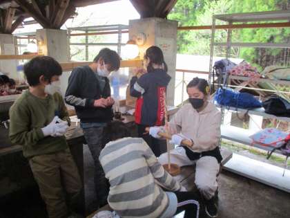 朝食後は,野外炊事に向けて,まずは自分たちで火種を作るための火起こし体験です。