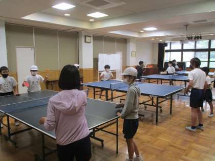 卓球クラブは,学年混合のグループを決めて,台ごとにルールを確認したり,打ち方を教え合ったりしていました。