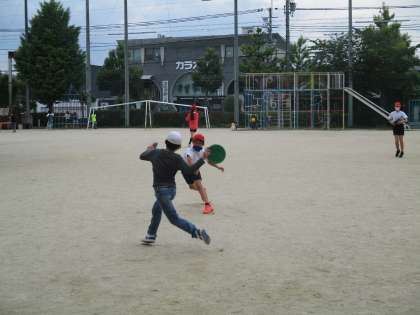 球技クラブでは,ソフトフリスビーを使って,チーム対抗のゲームをしていました。