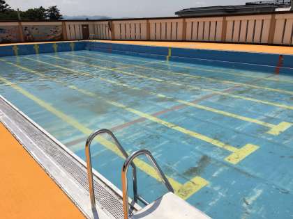 1年間の汚れがたまったプール。ブラシやたわしで擦って,こびりついた泥などをきれいに落としてくれました。
