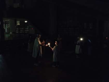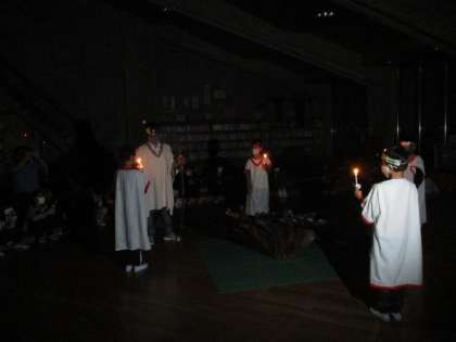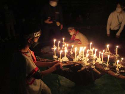 「協力」「挑戦」「勇気」「友情」の4つの火を山の神から分けていただき,火の精霊から一人一人のキャンドルに火を灯していきました。