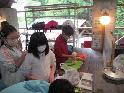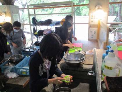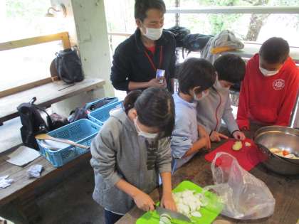 おかず係の子はジャガイモ・ニンジン・玉ねぎの皮をむき,包丁で切ります。