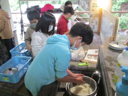 ごはん係の子は,ざるとボールを使ってお米を研いでいきます。