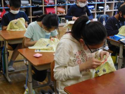 家庭科の学習では、針と糸を使って手縫いに挑戦しています。裁縫用具に触れるのがはじめての人も多く、玉結び、玉どめなど苦労する姿も見られましたが、練習を重ねるうちに少しずつ慣れてきたようです。