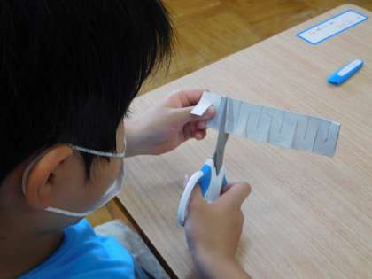 6月30日(木)5校時,生活単元学習の時間に七夕飾りを作りました。今日は「かいがら」と「あみかざり」を作りました。どちらも丁寧に色紙を半分に折る作業があります。みんなゆっくり丁寧に折っていました。また,はさみで直線を何本も切る作業があります。はさみの先で切るのではなく,刃を大きく開いて,刃の根元を使って切ることに注意して切りました。飾りを3つ作った後,短冊にそれぞれの願いを書きました。飾りを3つ,願いの短冊を1つ作ったところで地域の方にいただいた笹に結び付けました。みんなでもう少し飾りたいねと話し合いました。追加で作ろうと思います。