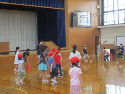 1年生は4年生が投げるドッジビーを避けるのに精いっぱいでしたが、キャーキャー言いながらも、とても楽しそうにしていました。