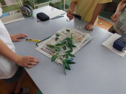 6年生の理科では,ホウセンカを使って,根から吸い上げた水が植物のからだのどこへ行っているのかを調べました。子どもたちは自分たちで,色水につけて実験する方法を考え,実践しました。色々なところを切って,水の通り道を興味津々に調べていました。