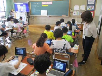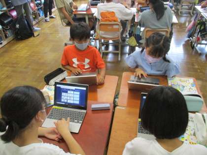 GIGA端末の「ロイロノート・スクール」を活用し、お互いの考えを交流しながら洗濯表示の種類や意味を確かめていました。