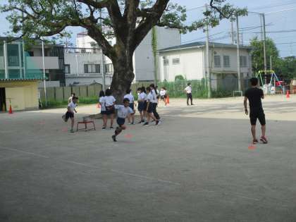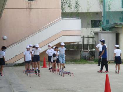 5年生は、ウォーミングアップの後、ミニハードルを使ったトレーニングをしていました。体を自分の思うように動かすための体幹やバランスを鍛えています。初めのころに比べて、どんどん動きがスムーズになってきています。