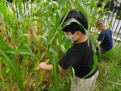 8月25日(木),2学期が始まりました。今日はイエローポップの収穫をしました。夏休みの間に大きくなったので,大きくなっていく過程を知らない子どもたちは驚いていました。少し黄色い部分が見えたので「できてるー!」と収穫への気持ちが高まりました。そのあとは,分担して収穫しました。自分の持っている袋にたくさん入ってくると嬉しくなったようで,どんどん収穫していました。収穫を終えるとそれぞれ自分の袋を見て満足そうでした。