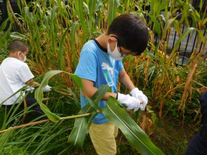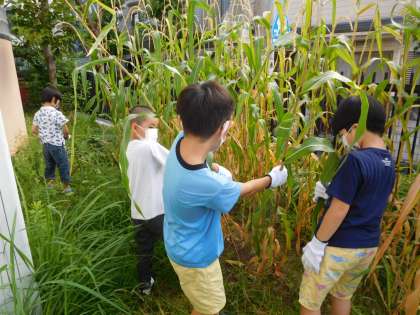 8月31日(水)収穫後の畑の後片付けで,イエローポップを畑から抜きました。これは結構大変な作業でした。イエローポップは自分たちの身長より高く,根がはっていてなかなか抜けませんでした。子どもたちは,「固い。」「根がすごいなぁ。」といいながら作業していました。「根をはってしっかり立っていたから,きつい風や大雨にも倒れずに育ったんだね。」とみんなで話し合いました。抜きにくかったのですが,みんな最後までしっかり仕事に取り組み,あっという間に畑がきれいになりました。今,次に育てたい野菜や花をそれぞれ調べて,話し合っています。どんな畑になるのか楽しみです。